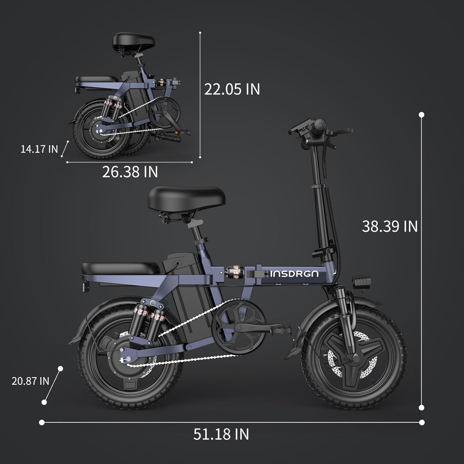 INSDRGN A14 electric bike features AI-powered pedal assist. 9 shock absorbers. a foldable design for unmatched comfort and portability.